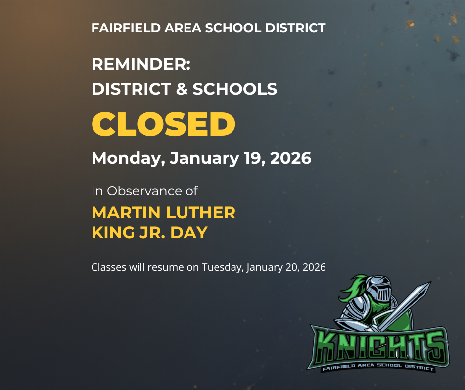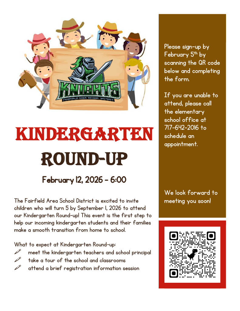 The Fairfield Area School District is excited to invite children who will turn 5 by September 1, 2026 to attend our Kindergarten Round-up on February 12th at 6:00pm. This event is the first step t...